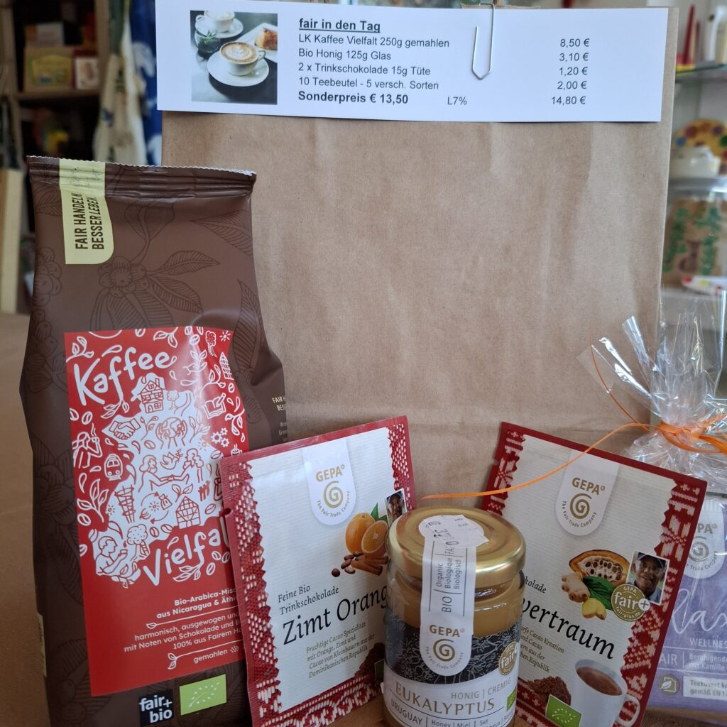 Im fair haben wir Frühstückstüten gepackt mit klassischen Inhalten, die auf der Aktionsfläche bereitstehen. Aus Anlass der Aktion erhalten Sie einen Rabatt auf die Produkte.